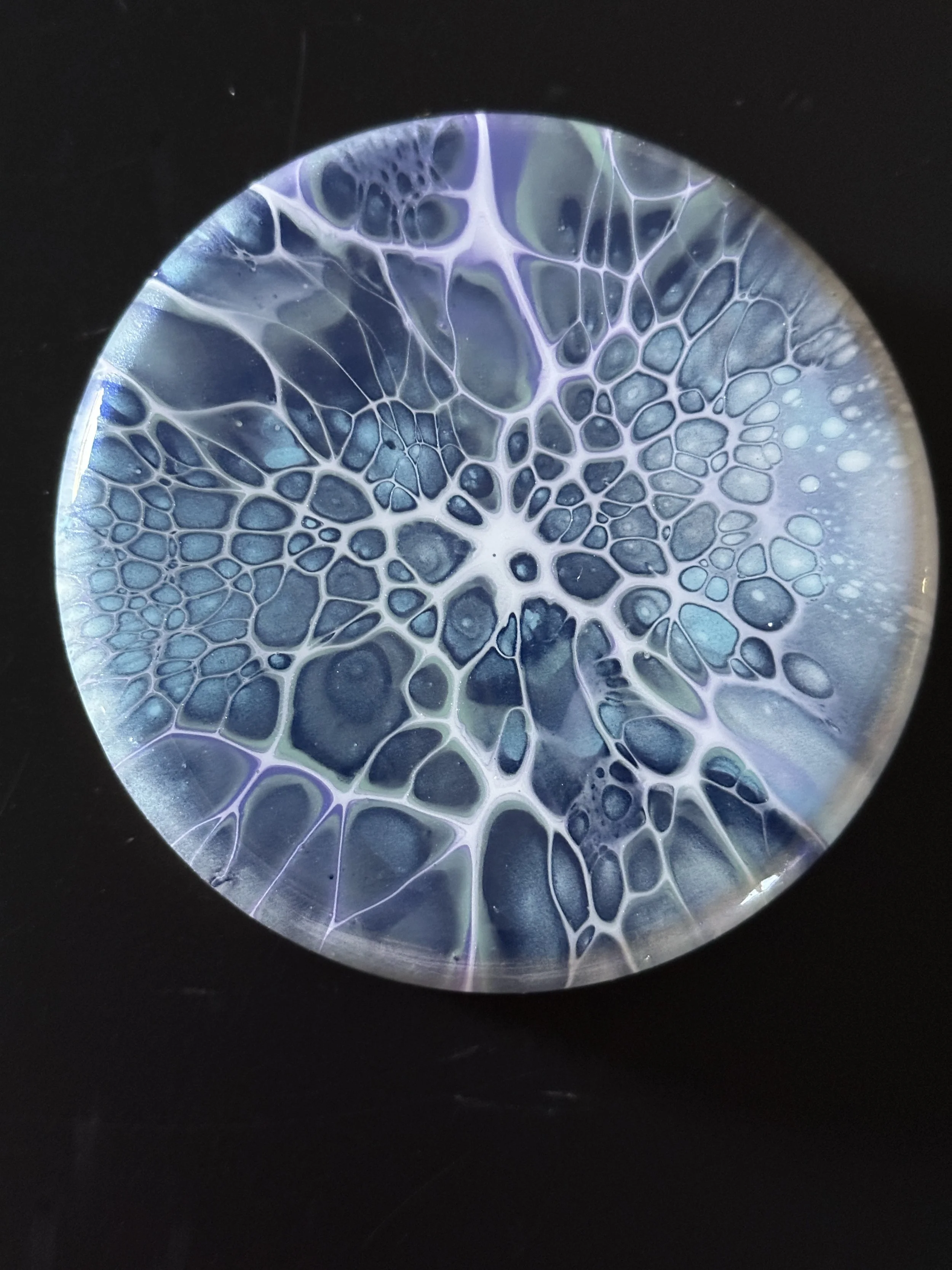 To create an acrylic bloom, there are multiple layers of different paints and paint colors which create a web of cells when a cell activator is blown across the top of the paints. Once the paint has cured, it is cleaned with alcohol and covered with 1-2 coats of high temperature tolerant epoxy resin which is also food contact safe. This ensures beauty that will withstand the test of time.