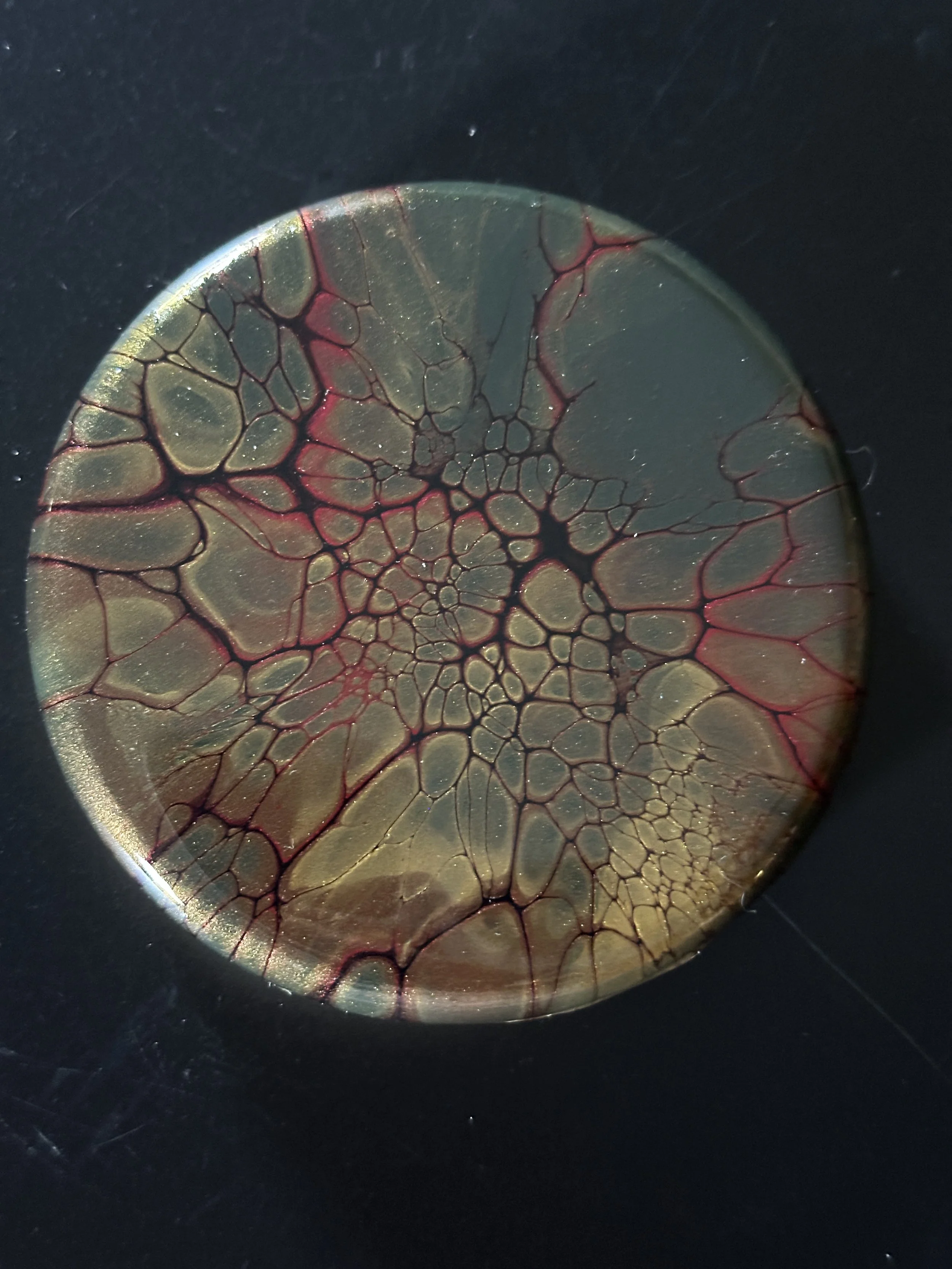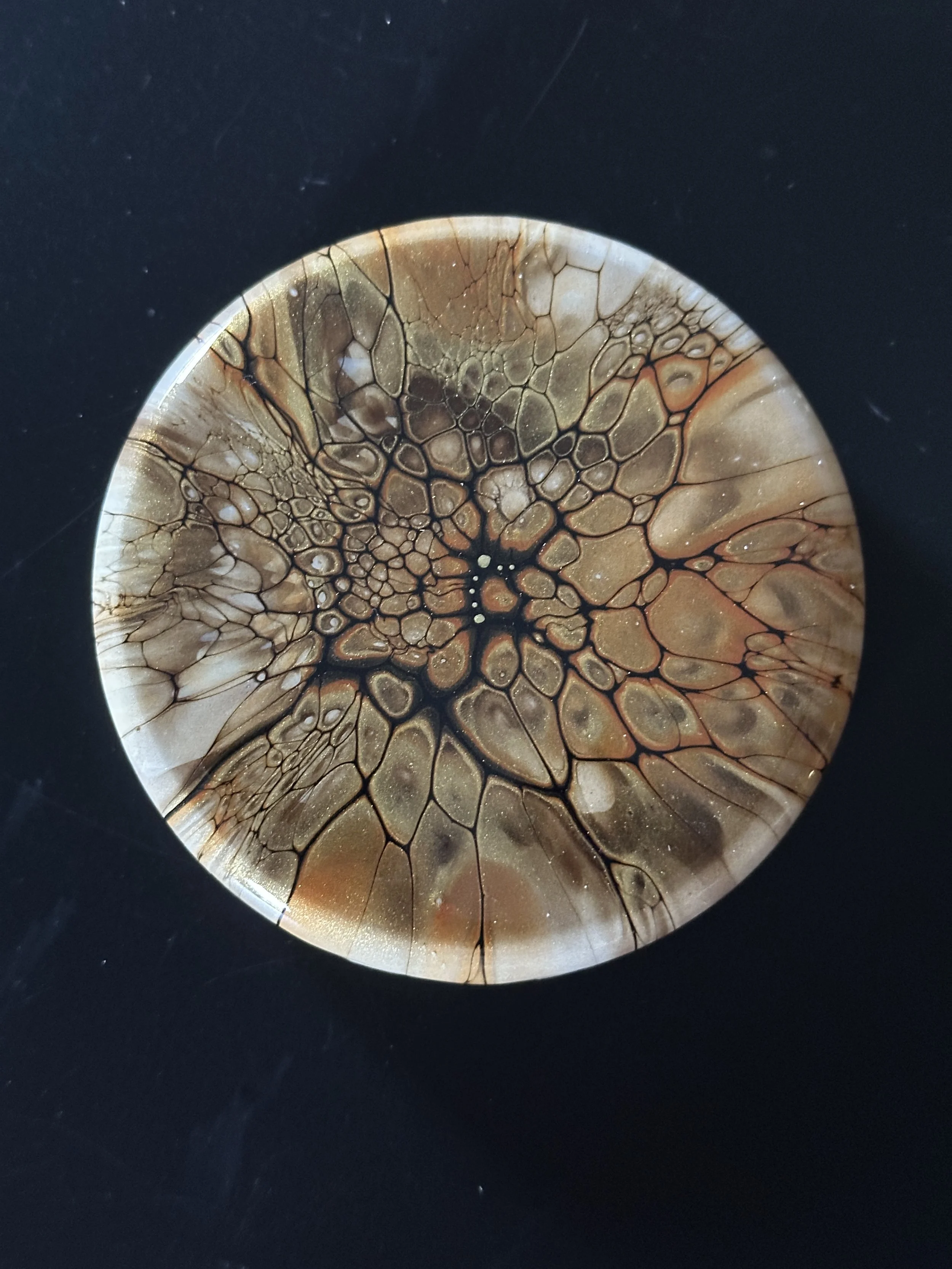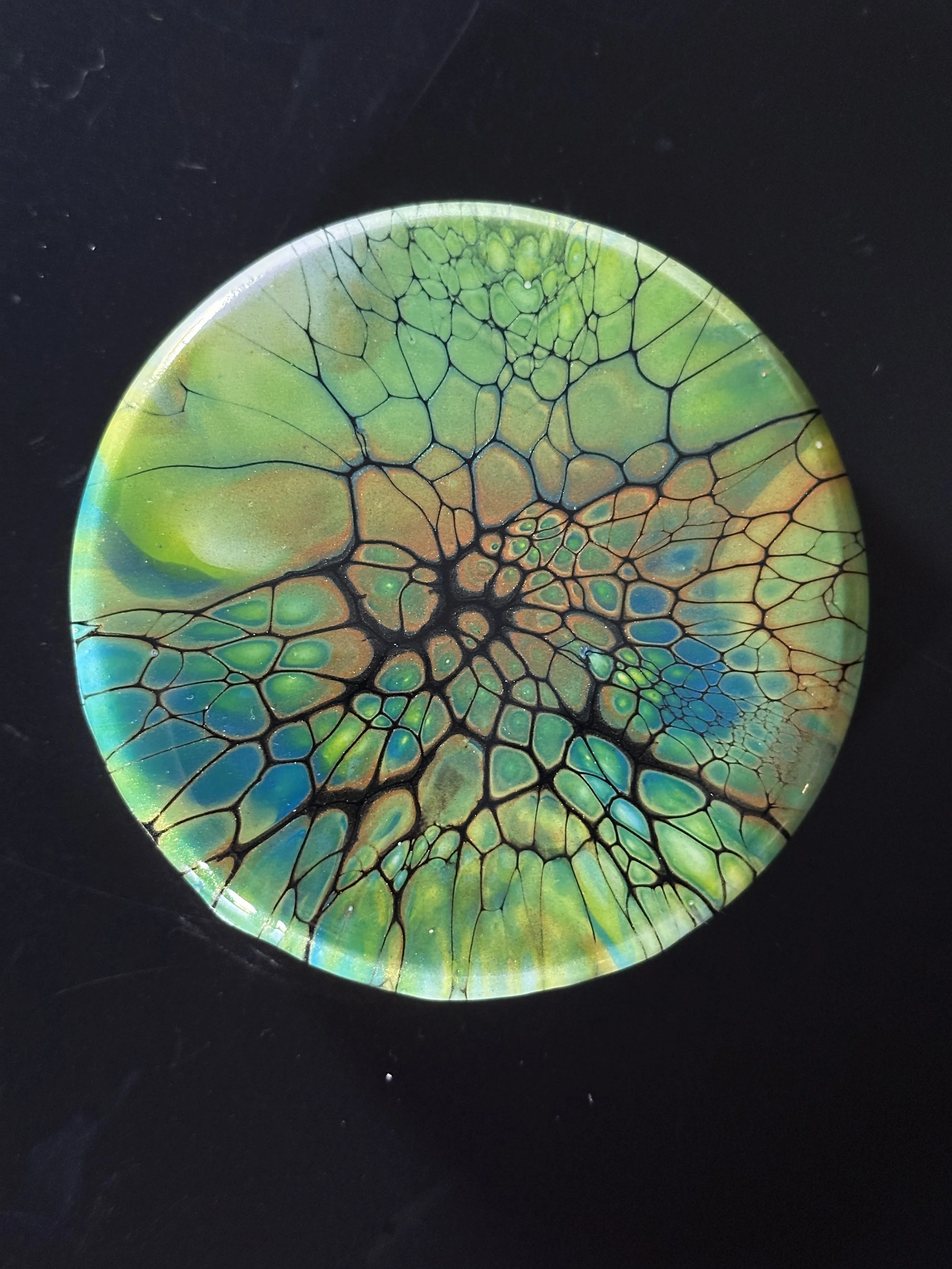 To create an acrylic bloom, there are multiple layers of different paints and paint colors which create a web of cells when a cell activator is blown across the top of the paints. Once the paint has cured, it is cleaned with alcohol and covered with 1-2 coats of high temperature tolerant epoxy resin which is also food contact safe. This ensures beauty that will withstand the test of time.
