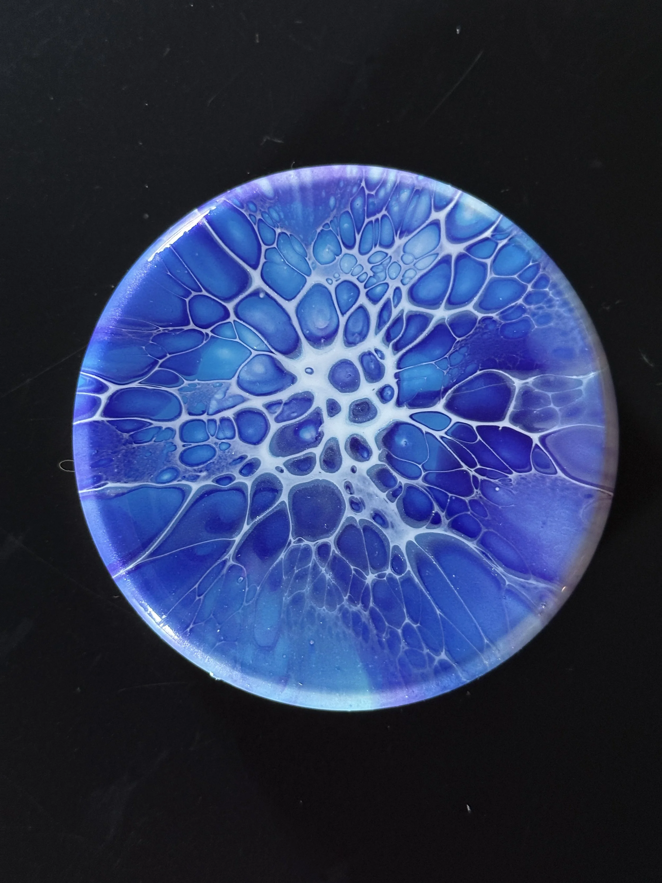 To create an acrylic bloom, there are multiple layers of different paints and paint colors which create a web of cells when a cell activator is blown across the top of the paints. Once the paint has cured, it is cleaned with alcohol and covered with 1-2 coats of high temperature tolerant epoxy resin which is also food contact safe. This ensures beauty that will withstand the test of time.