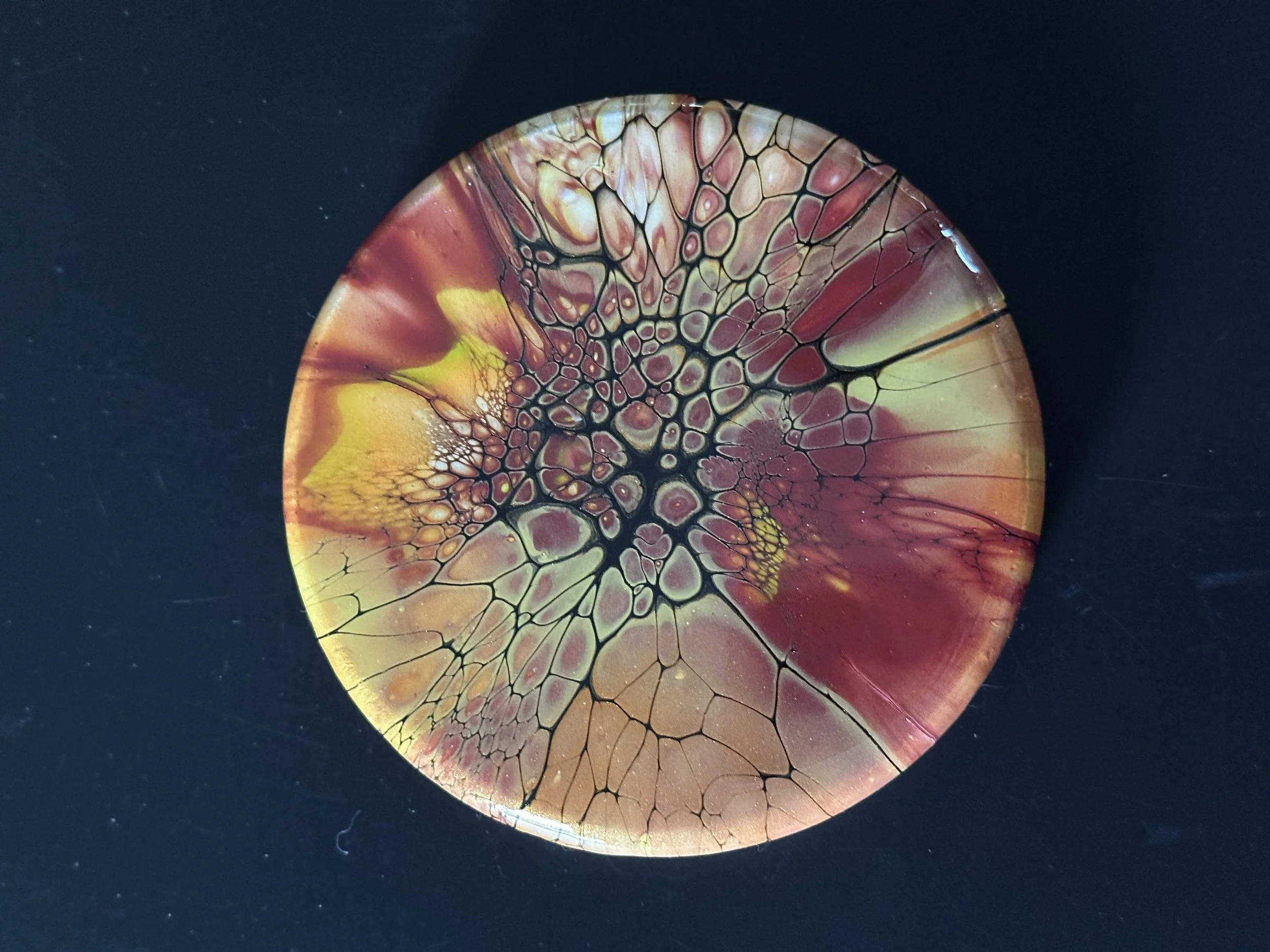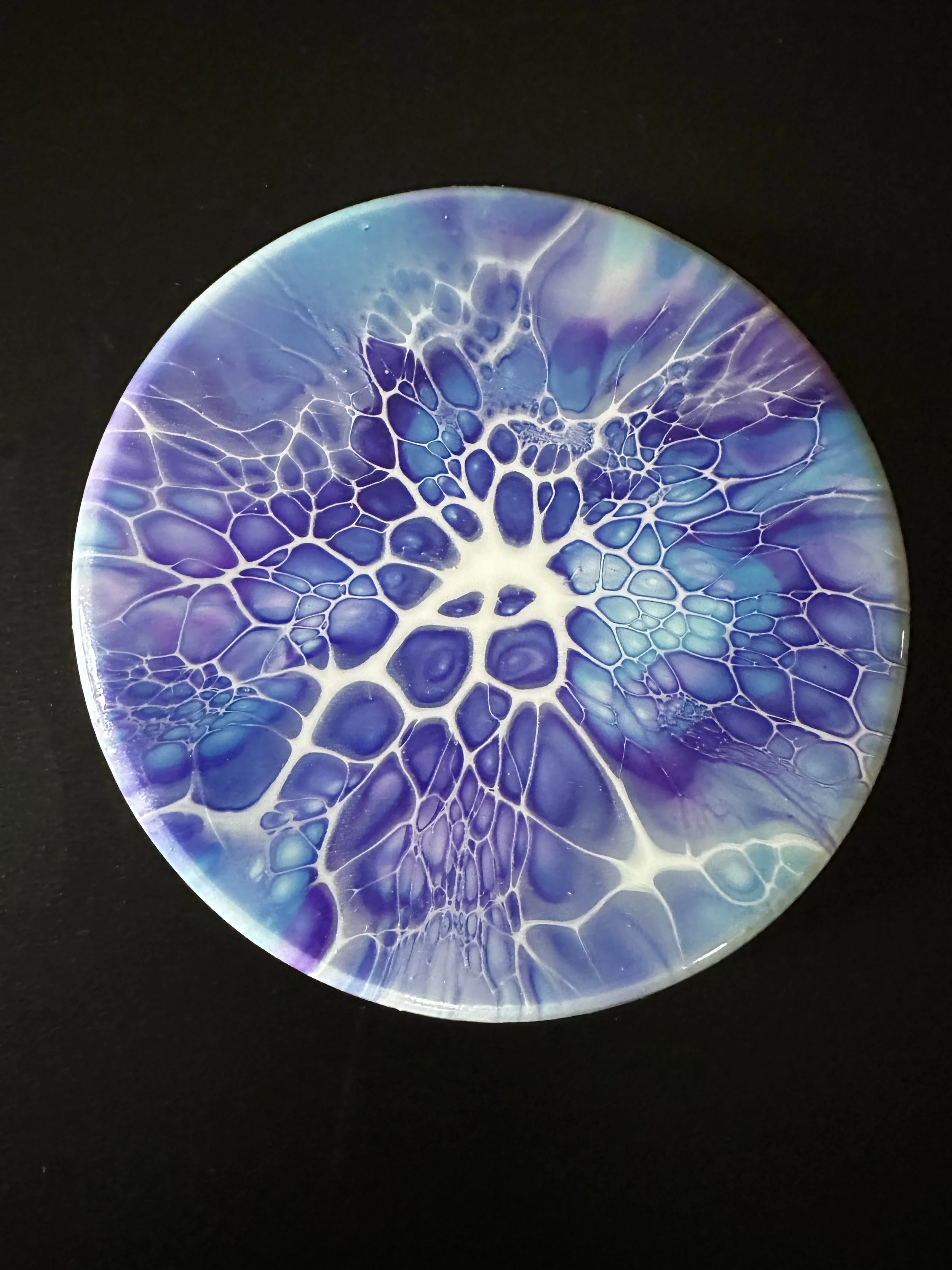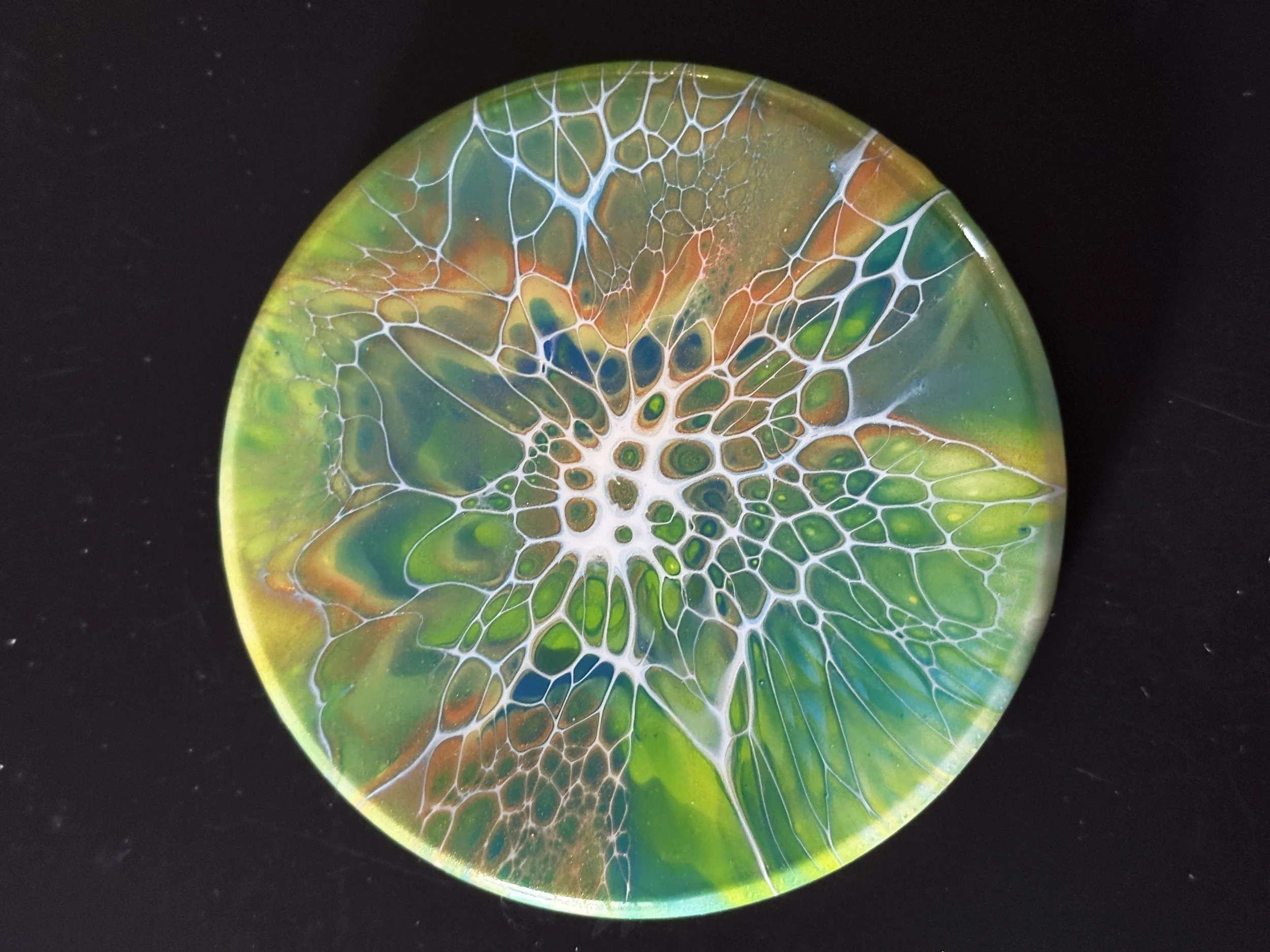 To create an acrylic bloom, there are multiple layers of different paints and paint colors which create a web of cells when a cell activator is blown across the top of the paints. Once the paint has cured, it is cleaned with alcohol and covered with 1-2 coats of high temperature tolerant epoxy resin which is also food contact safe. This ensures beauty that will withstand the test of time.