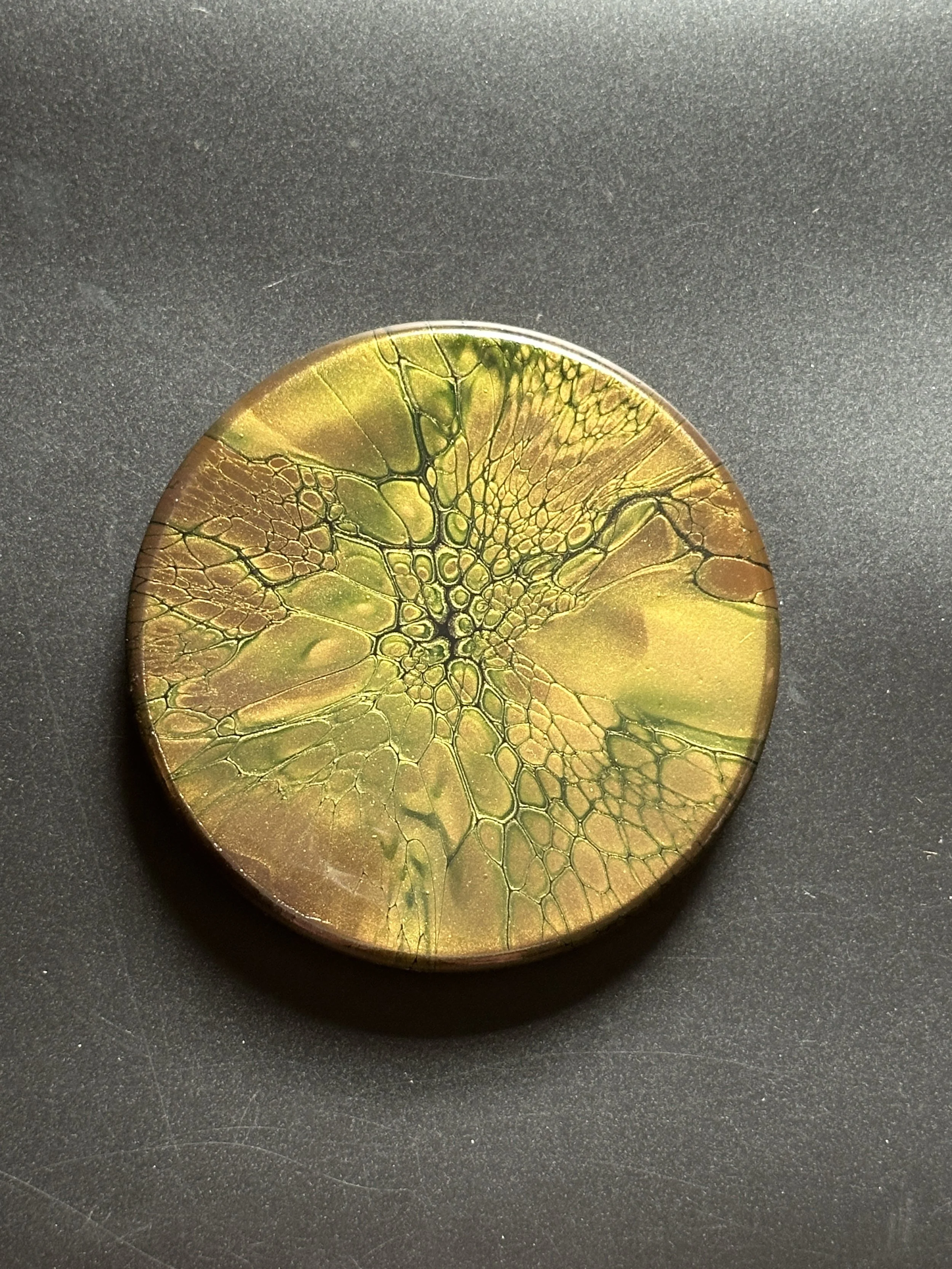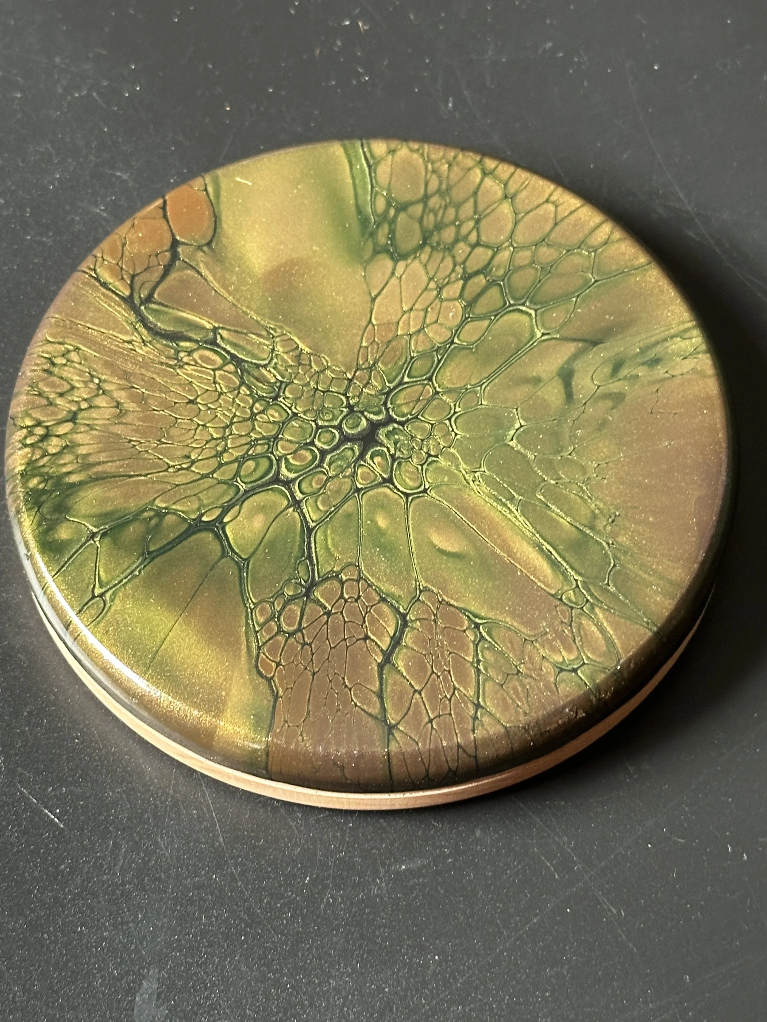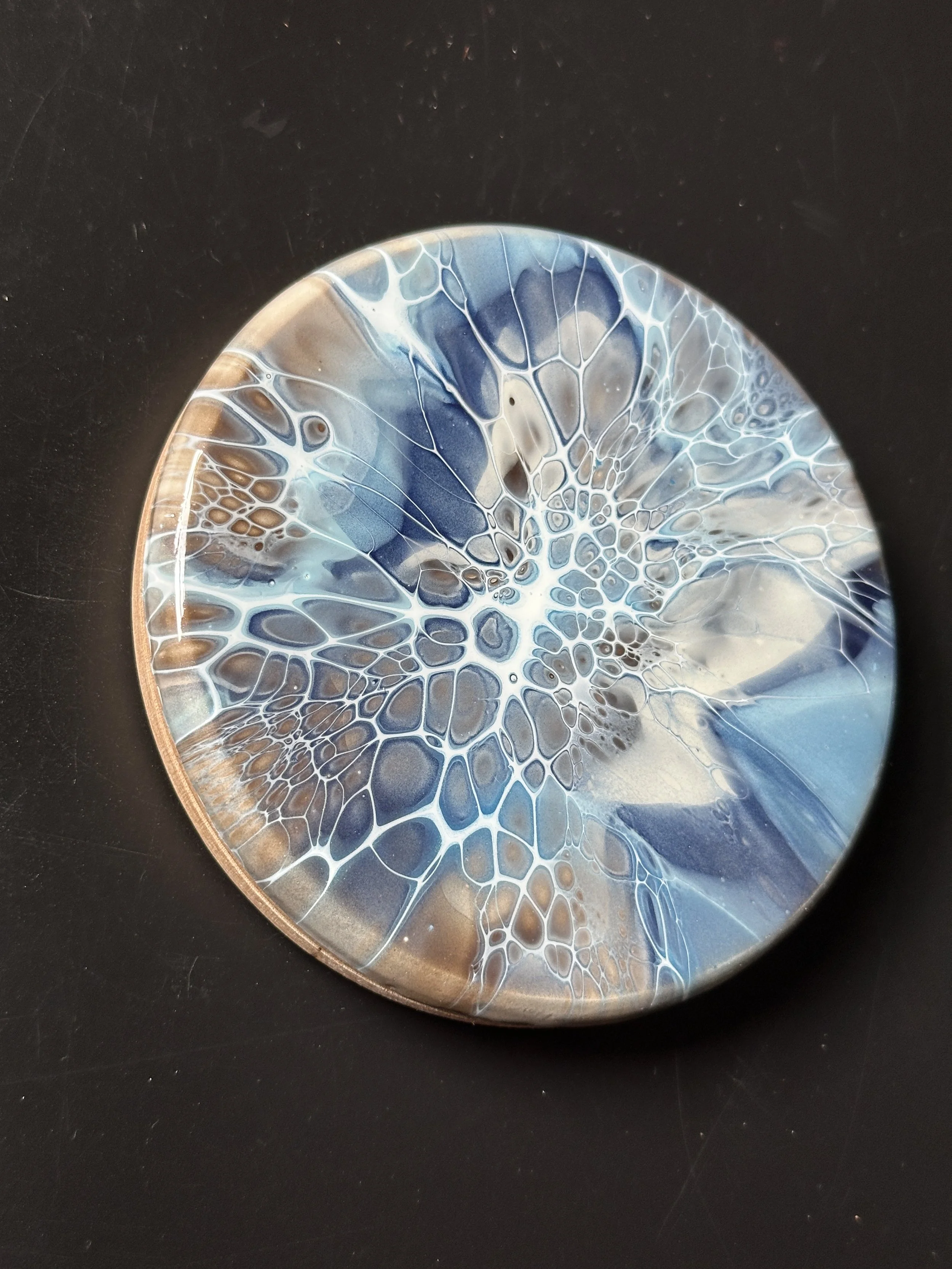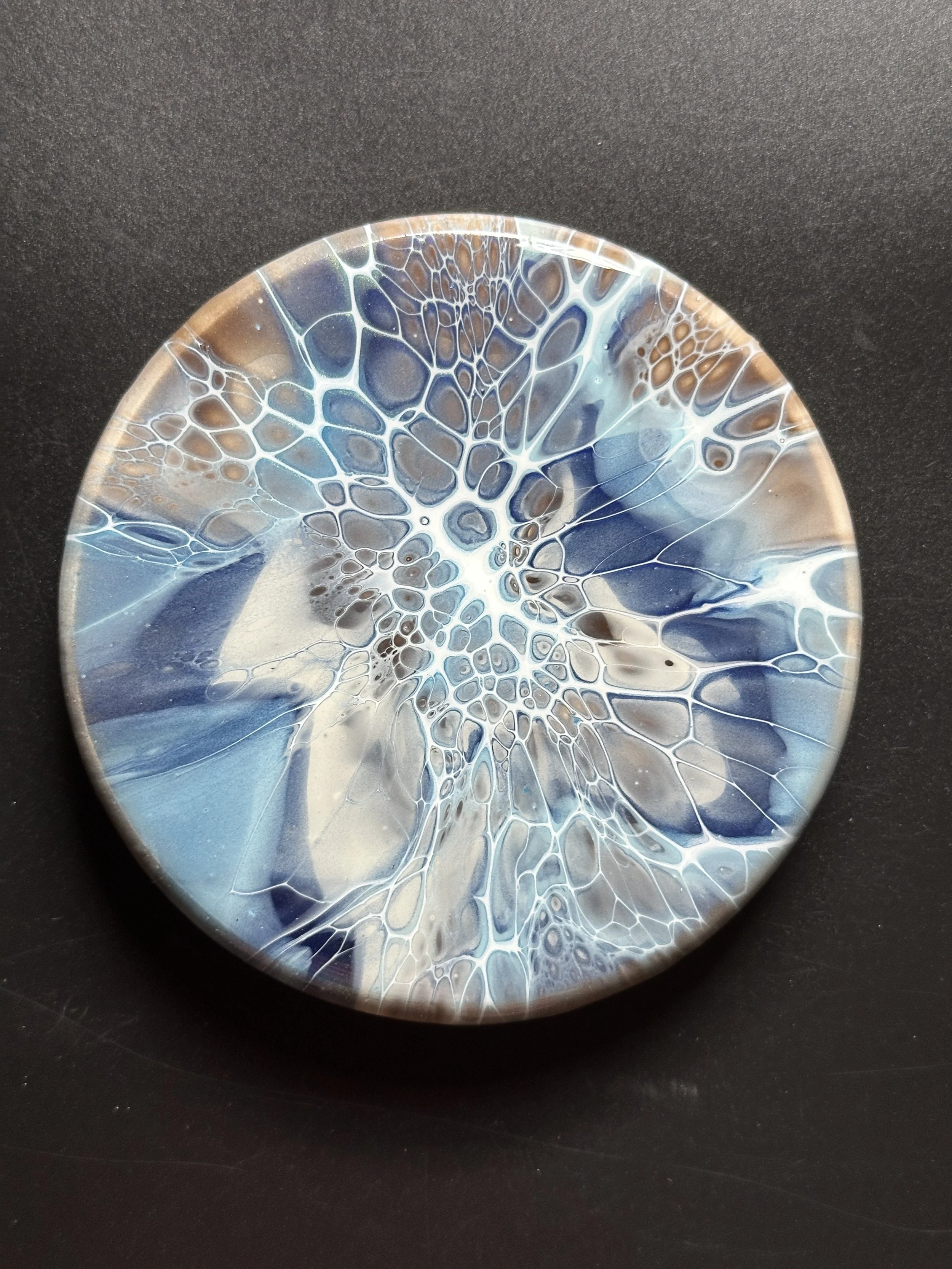 To create an acrylic bloom, there are multiple layers of different paints and paint colors which create a web of cells when a cell activator is blown across the top of the paints. Once the paint has cured, it is cleaned with alcohol and covered with 1-2 coats of high temperature tolerant epoxy resin which is also food contact safe. This ensures beauty that will withstand the test of time.