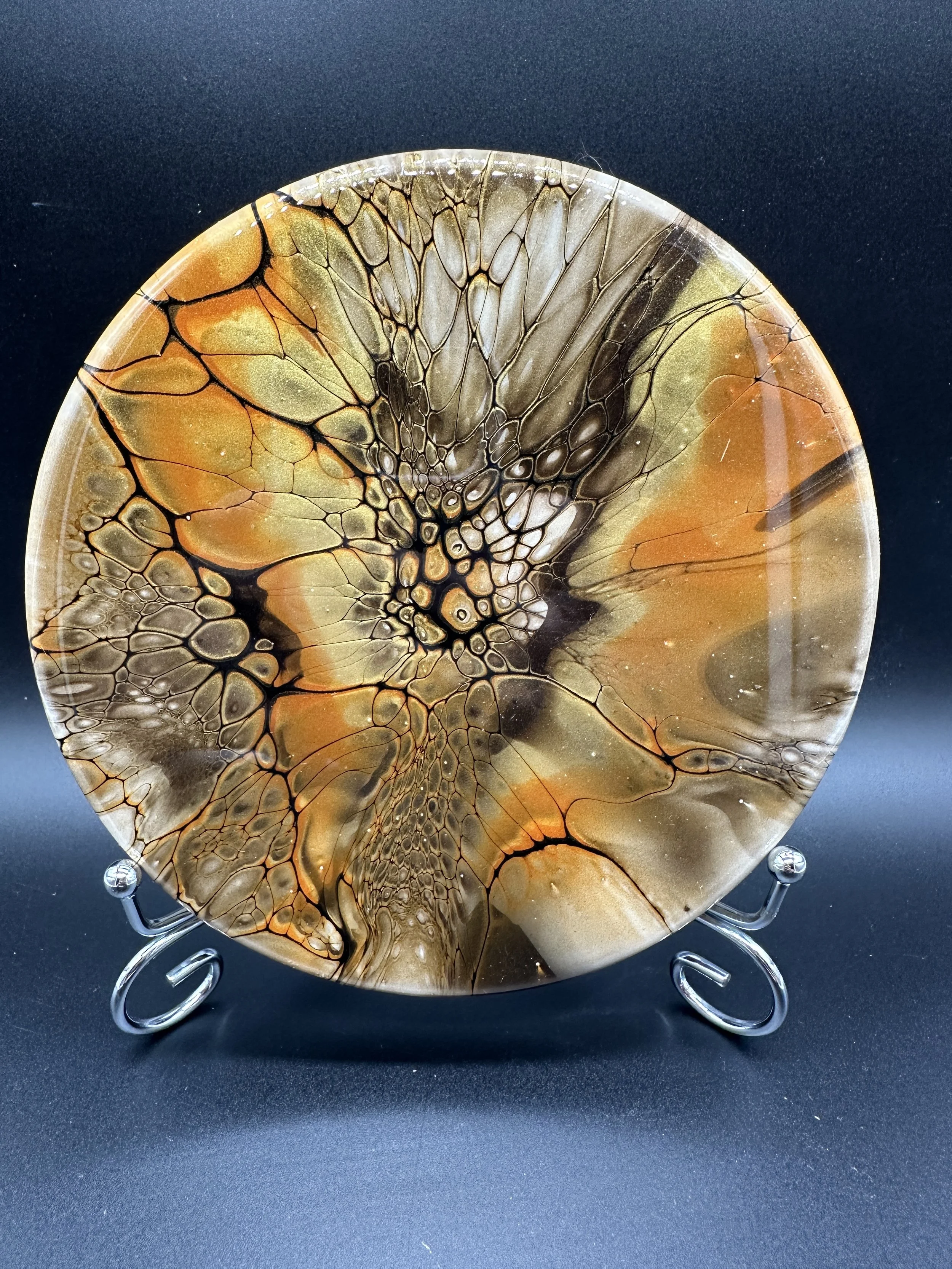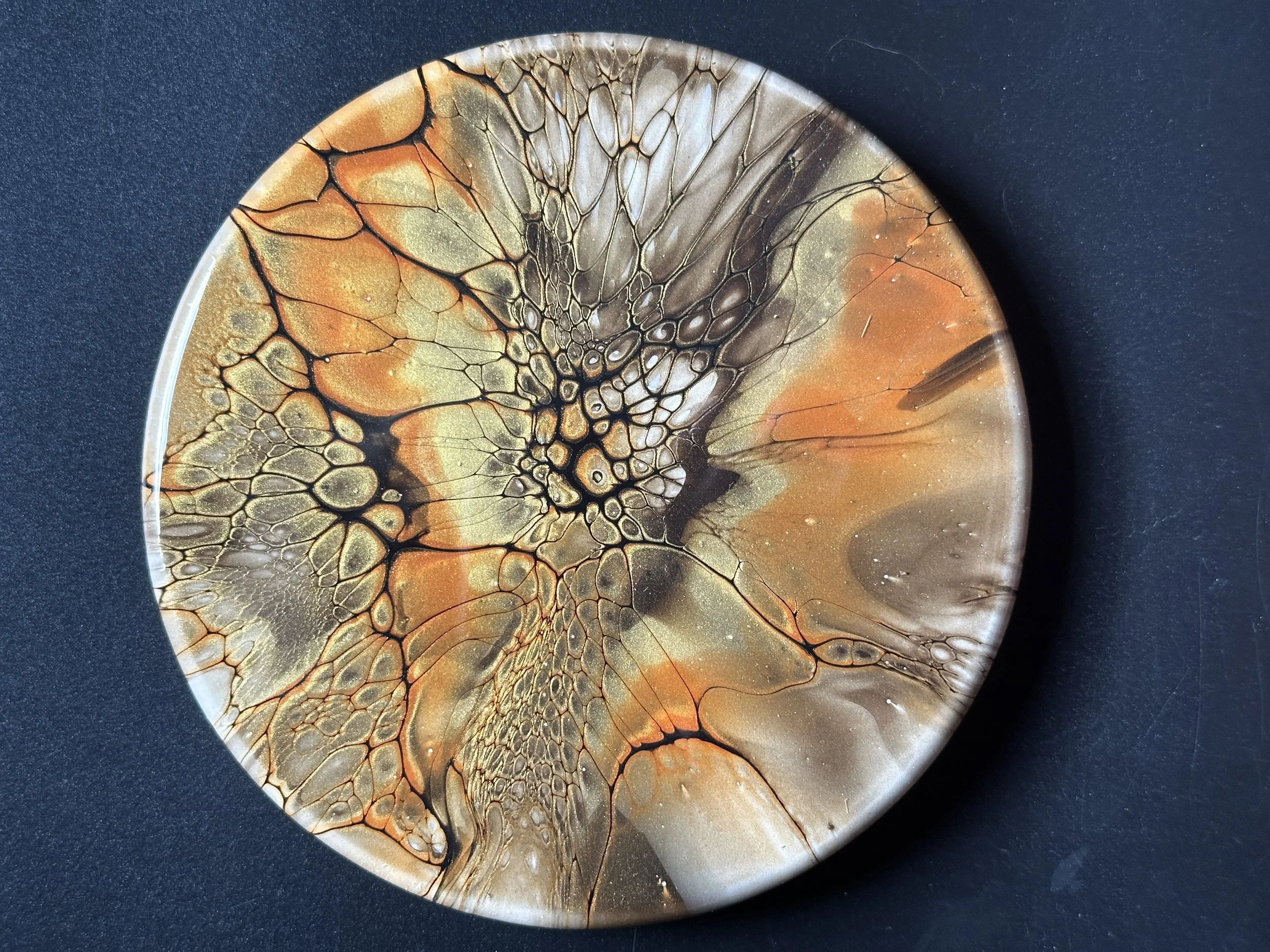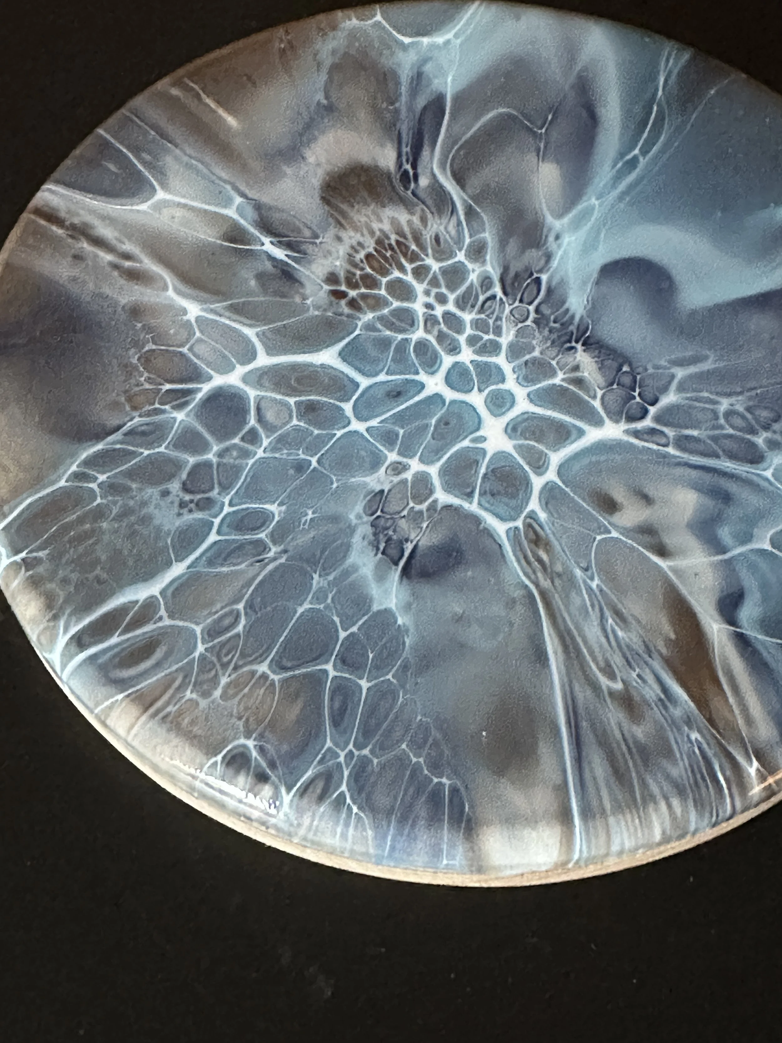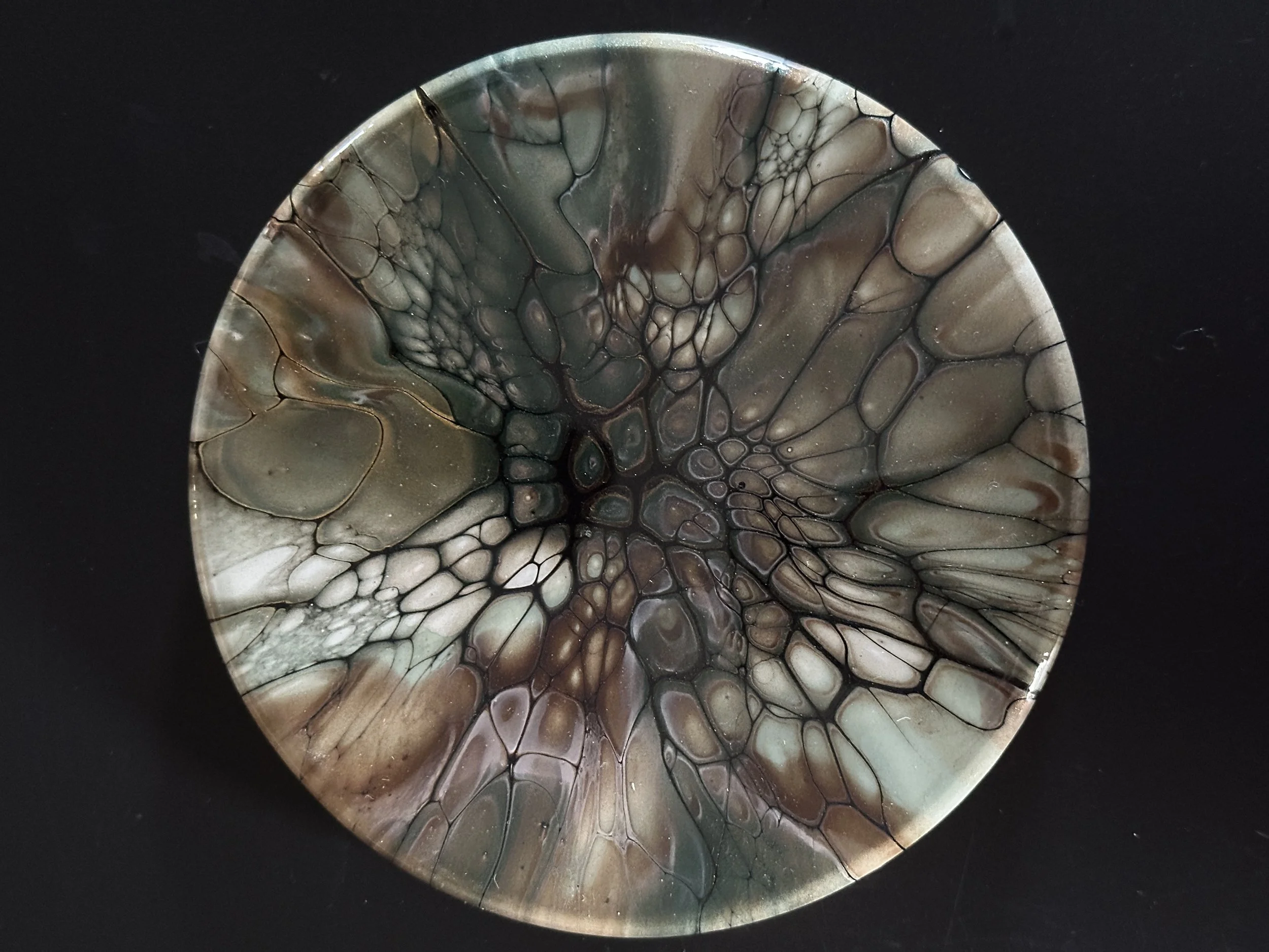 To create an acrylic bloom, there are multiple layers of different paints and paint colors which create a web of cells when a cell activator is blown across the top of the paints. Once the paint has cured, it is cleaned with alcohol and covered with 1-2 coats of high temperature tolerant epoxy resin which is also food contact safe. This ensures beauty that will withstand the test of time.