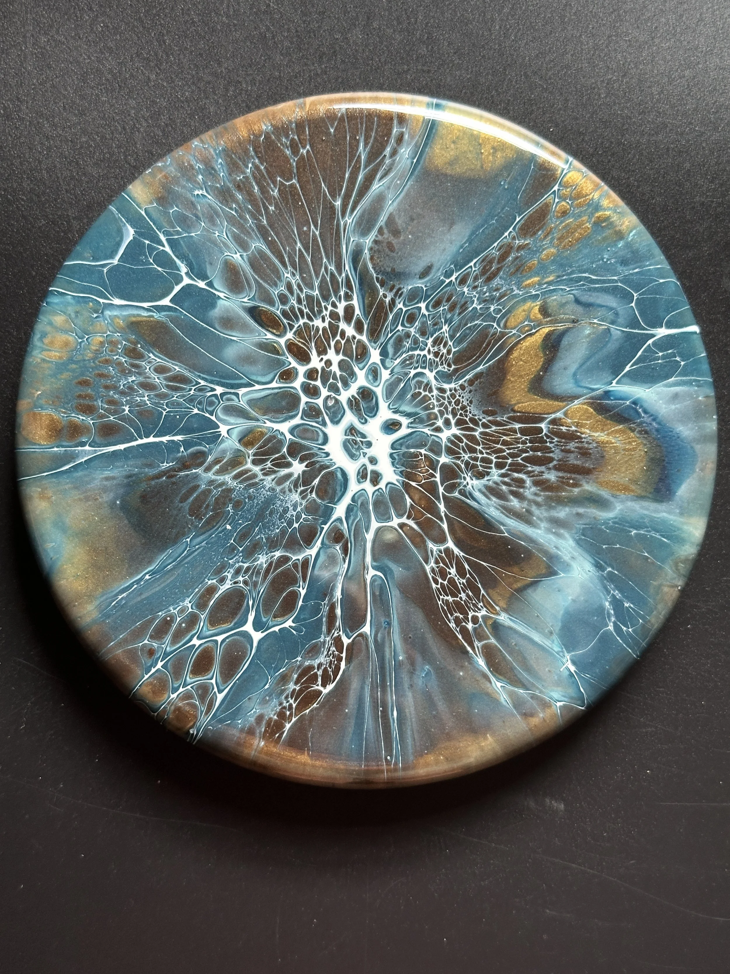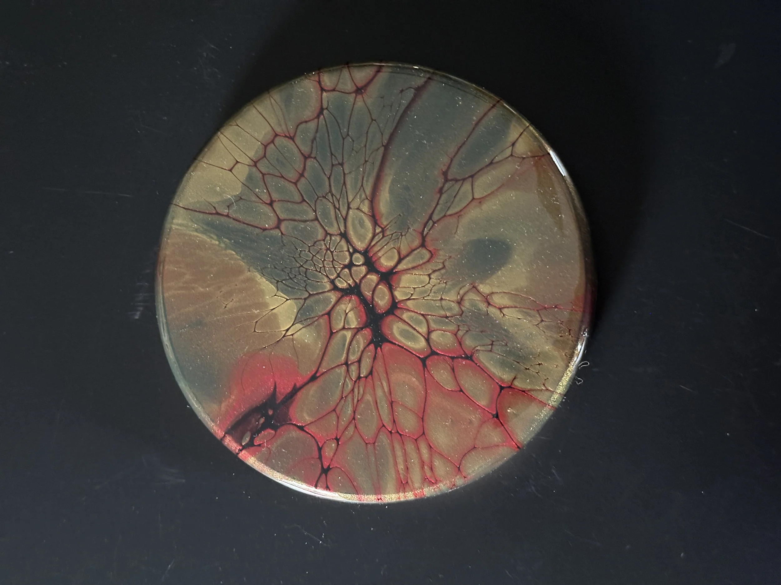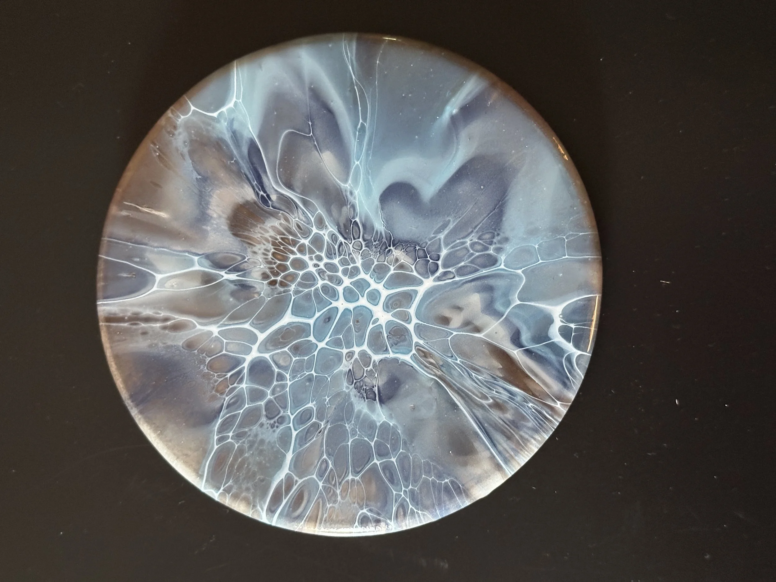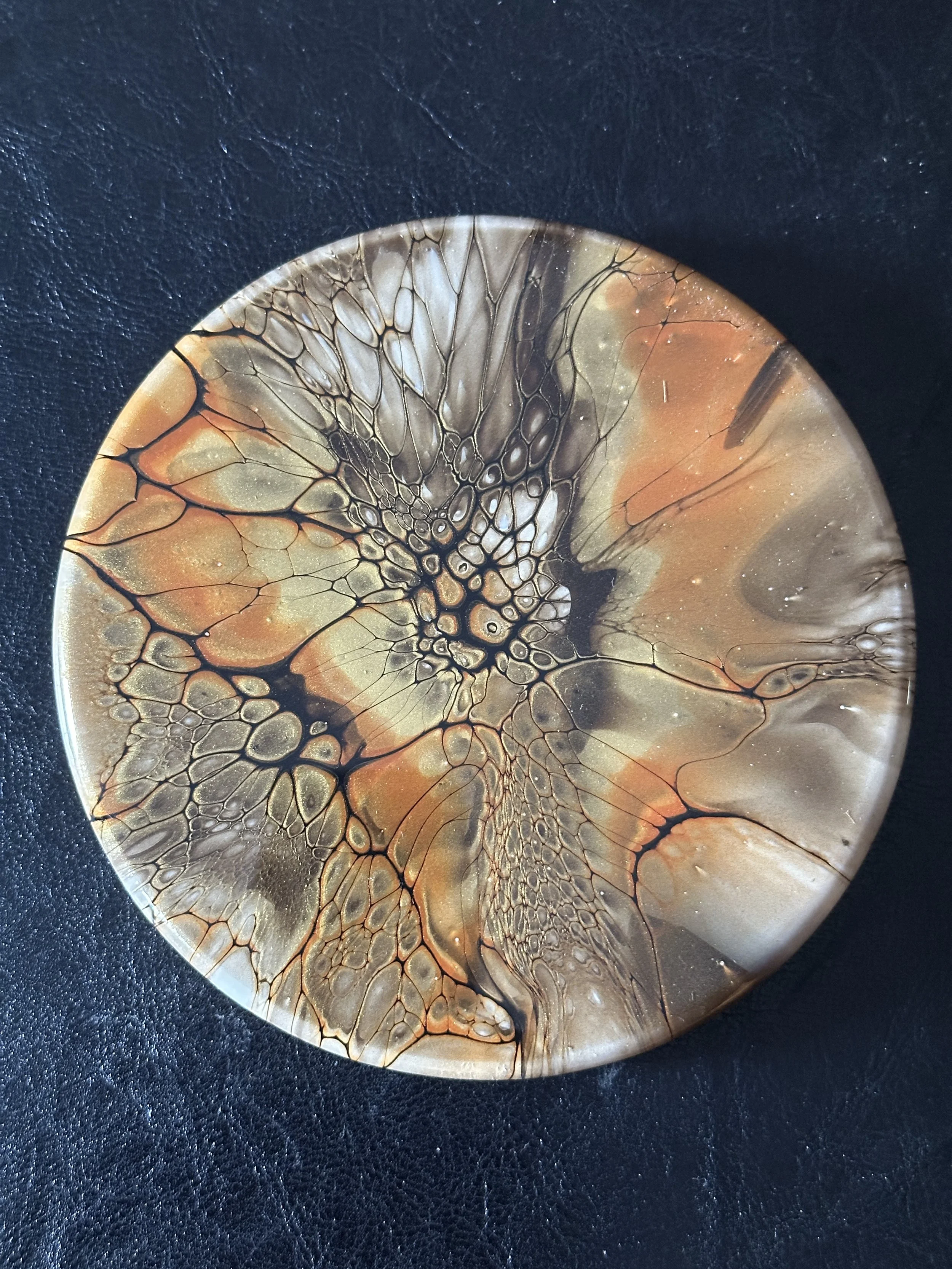 To create an acrylic bloom, there are multiple layers of different paints and paint colors which create a web of cells when a cell activator is blown across the top of the paints. Once the paint has cured, it is cleaned with alcohol and covered with 1-2 coats of high temperature tolerant epoxy resin which is also food contact safe. This ensures beauty that will withstand the test of time.