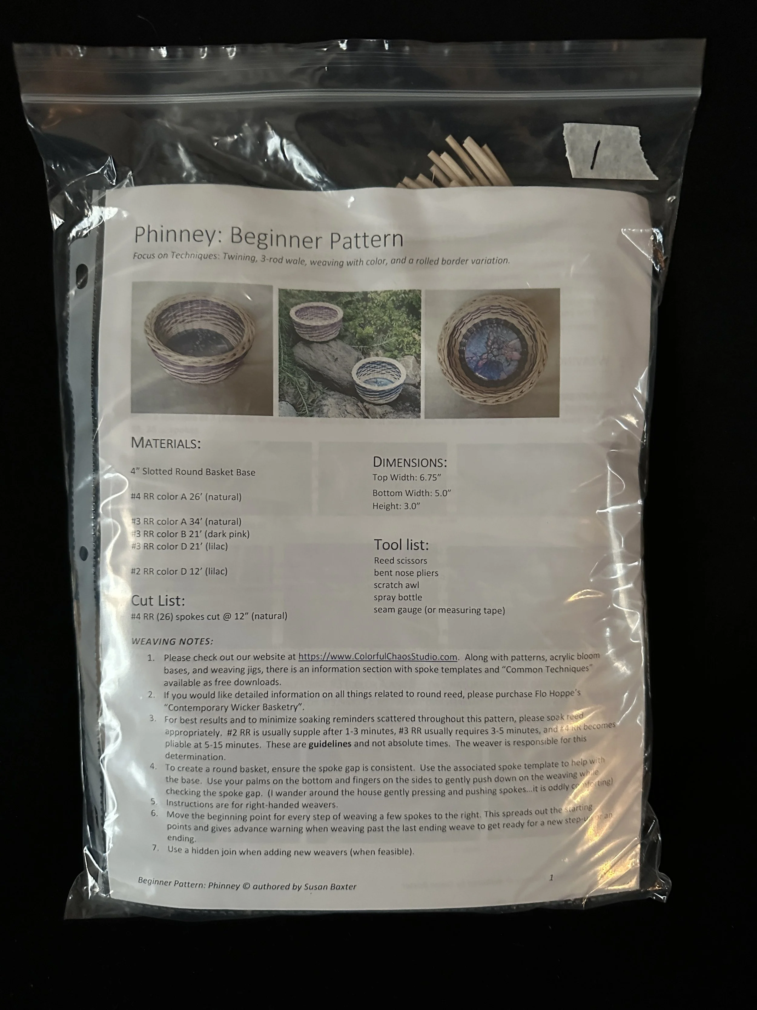 The kit include one Sullivan pattern (5 pages, 21 photos), one 4” acrylic bloom base, one 27 spoke template and plenty of color coordinated round reed to weave this stunning basket. The solid hardwood base has been painted in the SheleeArt Bloom style and coated with 1-2 coats of epoxy for lasting beauty. Please be aware that this is an beginner kit and the weaver will find 3 pages of Common Techniques enclosed to either refresh or enhance their skill set.