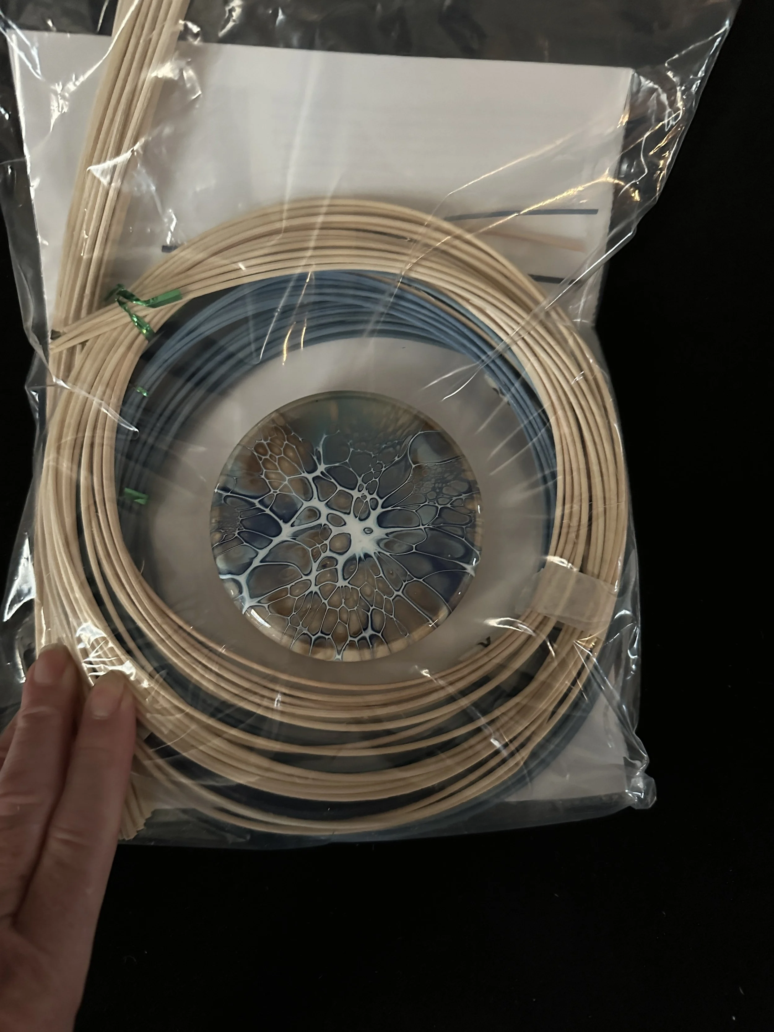 The kit include one Phinney pattern (5 pages, 20 photos), one 4” acrylic bloom base, one 26 spoke template and plenty of color coordinated round reed to weave this stunning basket. The solid hardwood base has been painted in the SheleeArt Bloom style and coated with 1-2 coats of epoxy for lasting beauty. Please be aware that this is an beginner kit and the weaver will find 3 pages of Common Techniques enclosed to either refresh or enhance their skill set.